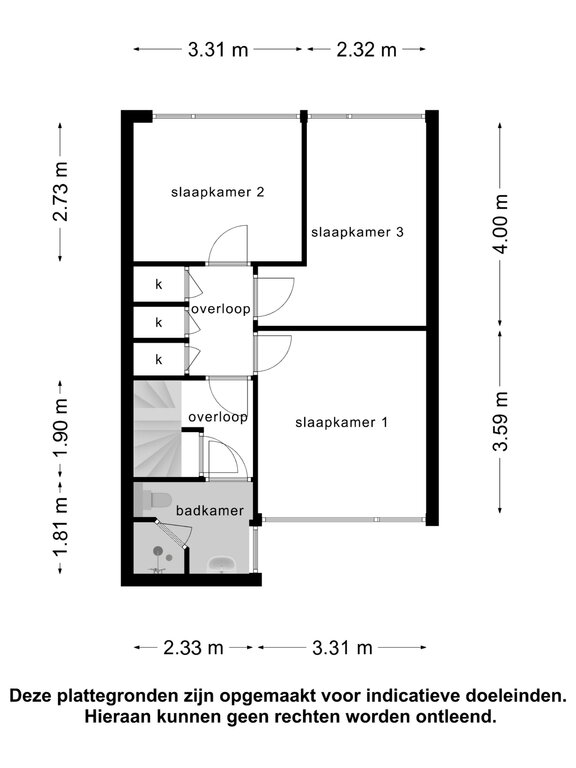 – Slaapkamer 2 (ca. 10m2) en 3 (ca. 9m2) zijn gelegen aan de achterzijde en allebei voorzien van elektrische rolluiken.