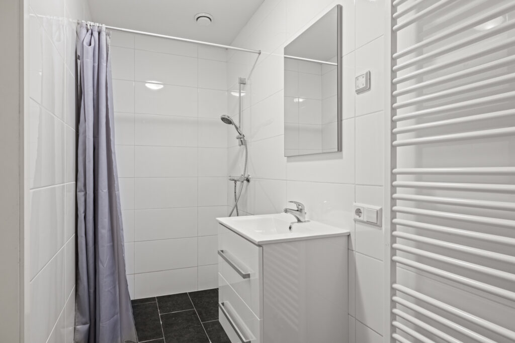 Het appartement biedt één slaapkamer. Gelegen aan de achterzijde kun je hier in alle rust heerlijk slapen. ’s Ochtends stap je vanuit je bed direct de badkamer in om je dag te starten met een frisse douche. Ook is de badkamer voorzien van een wastafelmeubel met wastafel, de aansluiting voor de wasmachine en de Cv-ketel.
