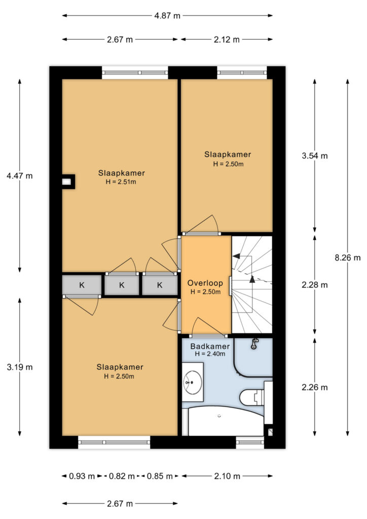 Op de eerste verdieping van de woning vind je drie slaapkamers. De masterbedroom met twee praktische inbouwkasten bevindt zich aan de achterzijde van de woning. Ook vind je aan de achterzijde een tweede kamer voor bijvoorbeeld een knusse babykamer of werkplek. De derde (slaap)kamer is gelegen aan de voorzijde van de woning.