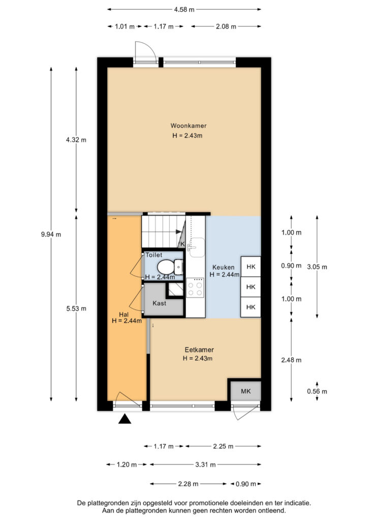 Je stapt binnen in de hal, waar je direct toegang hebt tot het moderne toilet en een handige voorraadkast. Loop je rechtsaf, dan kom je in de eetkamer – een fijne plek aan de voorzijde van de woning waar je met gemak een grote eettafel kunt plaatsen.