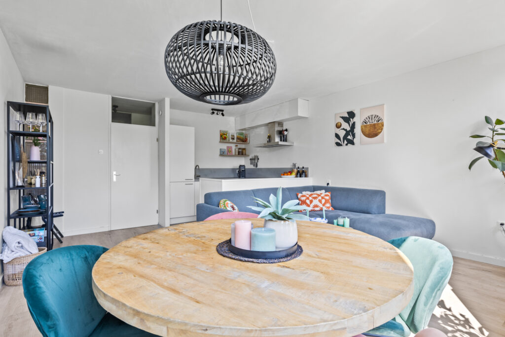 Via de hal stap je binnen in een woonkamer die direct uitnodigt om neer te ploffen. De open keuken, vernieuwd in 2022, vormt het hart van het appartement en is strak, modern en praktisch ingedeeld. Met een inductiekookplaat, afzuigkap, koel-/vriescombinatie, oven en vaatwasser heb je alles bij de hand. Het lage muurtje tussen keuken en living werkt als een subtiele scheidslijn, zodat je tijdens het koken toch contact houdt met je gezelschap. De zithoek voelt knus en comfortabel, een plek waar je ’s avonds tot rust komt. De ronde eettafel bij het raam maakt de ruimte compleet: ideaal voor een gezellige maaltijd of een ontspannen start van de dag met uitzicht naar buiten. Dankzij de vier ramen op de hoek baadt de kamer in het daglicht en voelt de ruimte extra open en levendig.