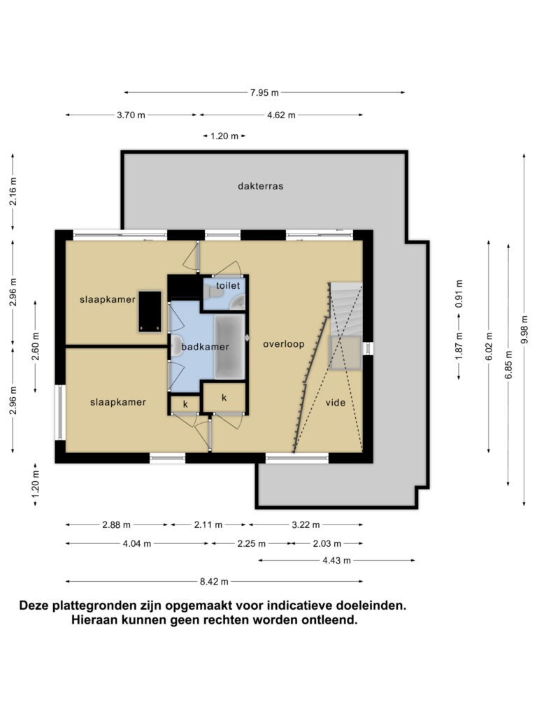 Op de eerste verdieping zijn twee slaapkamers te vinden. Beide slaapkamers zijn voorzien van vloerbedekking en een praktische inbouwkast. Ook hebben beide slaapkamers directe toegang tot de badkamer. Deze tweede badkamer is compact, maar van alle gemakken voorzien om te verfrissen, waaronder een ligbad, douche en een wastafel. De ruime overloop biedt de mogelijkheid voor bijvoorbeeld een fijne werkplek. Zowel vanaf de overloop als vanuit de slaapkamer aan de achterzijde van de woning bieden schuifdeuren toegang tot het dakterras.