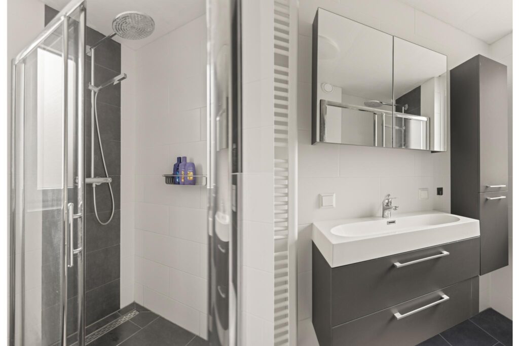 De badkamer is modern en functioneel: volledig betegeld en voorzien van een inloopdouche, wastafelmeubel, toilet en een designradiator. Praktisch én stijlvol.