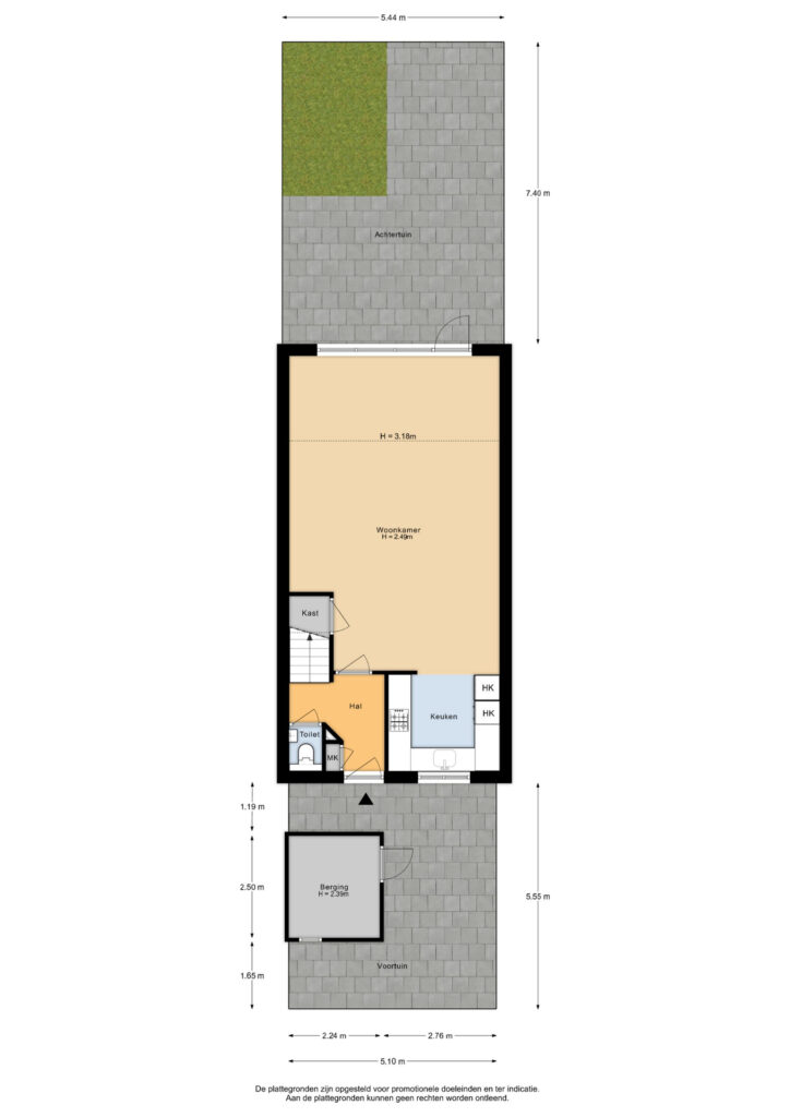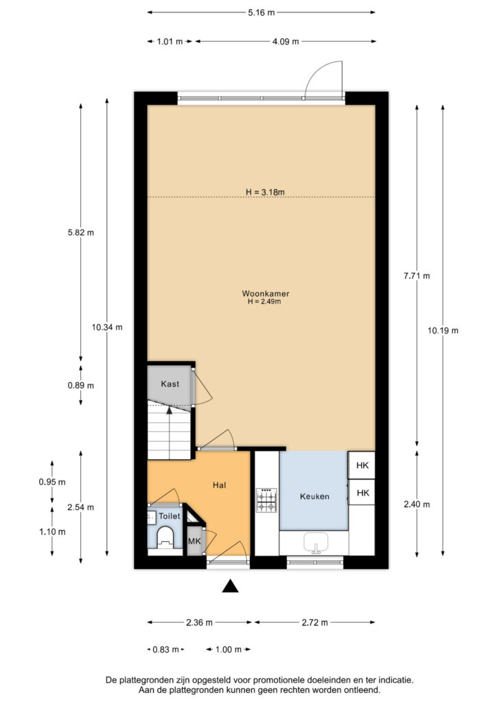 De open keuken aan de voorzijde biedt niet alleen een fijn uitzicht op het groen, maar ook alles wat je nodig hebt om met plezier te koken. Met een gaskookplaat, combi-oven, vaatwasser en koel-/vriescombinatie ben je van alle gemakken voorzien. De moderne afwerking en stijlvolle spots maken het plaatje compleet. In de hal bevinden zich de meterkast en het toilet.