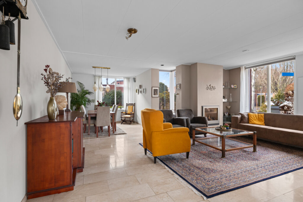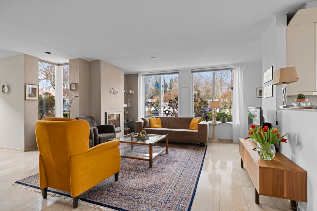 Wanneer u binnenstapt in de woonkamer, valt direct op hoe heerlijk licht de woning is. Dankzij de vele ramen valt het daglicht rijkelijk naar binnen en ontstaat een prettige, open sfeer. De voortuin zorgt daarbij voor beschutting en privacy, waardoor u vrij woont zonder in te leveren op licht. In de woonkamer creëert u rondom de sfeervolle (gas)haard een gezellige zithoek. Ook is er ruimte voor een eethoek om samen uitgebreid te tafelen. In de woonkamer en de hal ligt een marmeren vloer die dankzij vloerverwarming altijd comfortabel aanvoelt.