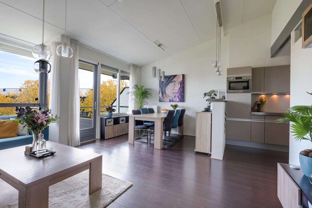 De grote raampartijen vallen direct op, wanneer je binnen stapt in de living op de 1e verdieping. Zo kijk je vanaf de bank heerlijk weg over het water. Ook heb je vanuit de living toegang tot het balkon, waar je op een zomerse ochtend al vroeg in de zon van je eerste kopje koffie kunt genieten.