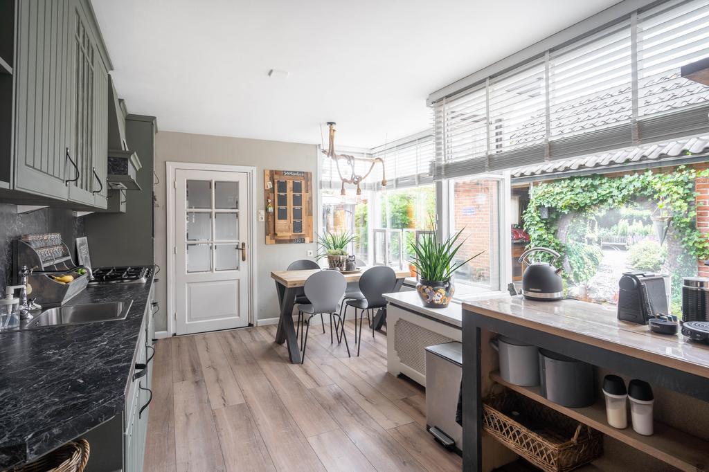 Je komt binnen in een sfeervolle living. Een woonkamer met genoeg plek voor een fijne loungeplek en een uitgebouwde (woon-)keuken met heel veel licht. Vanuit de keuken loop je door naar de praktische bijkeuken mét een ingebouwde wasmachine/-droger opstelling. De keuken beschikt over een rechte opstelling met diverse inbouwapparatuur. Waaronder 5-pits gaskookplaat, afzuigkap, koelkast, combi-oven (ter overname) en een vaatwasser.
