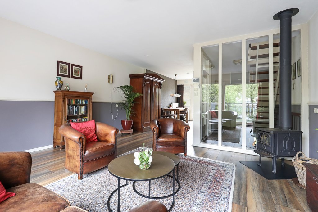 – De lichte living is gelegen aan de achterzijde en beschikt over voldoende ruimte voor een ruime zit- en eethoek, een sfeervolle houtkachel en een schuifpui met toegang tot het heerlijk zonnige balkon (zuidwesten);