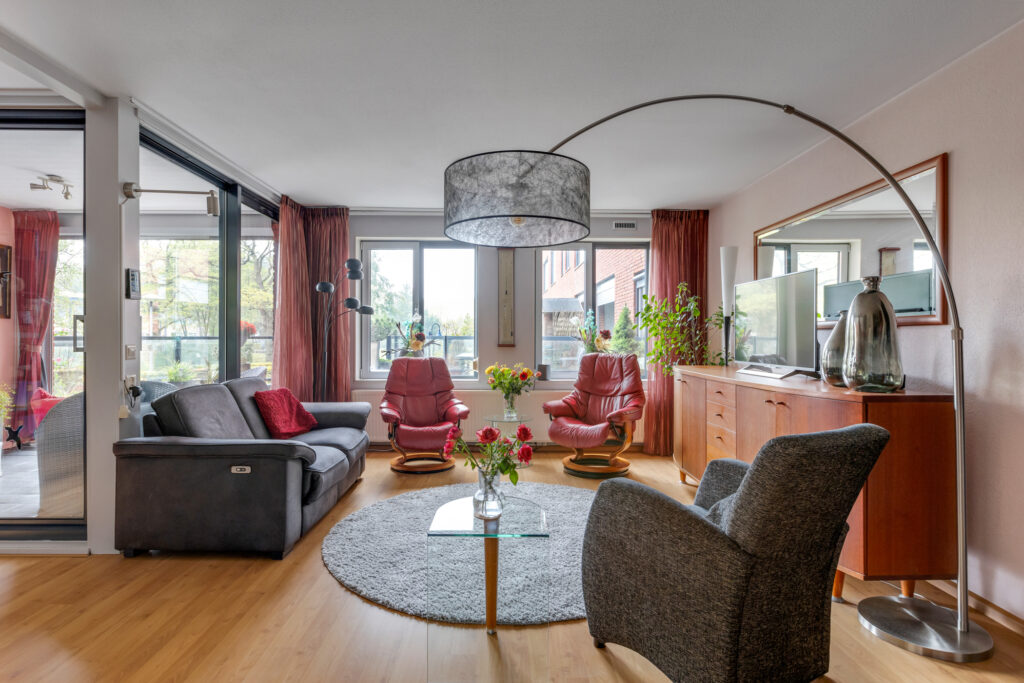 Wat direct opvalt, wanneer je binnenstapt in de woonkamer, is de ruime indeling. Koken, eten, werken en samen ontspannen, het kan hier allemaal! Zo is er aan de rechterzijde van de woonkamer ruimte voor het creëren van een gezellige zithoek. Vanuit de luie stoel geniet je hier van het groene uitzicht over de binnentuin. Aan de linkerzijde van de woonkamer is er ruimte voor een eethoek, waar je familie of vrienden uitnodigt om samen uitgebreid te tafelen. Ook onderdeel van de woonkamer, is de open keuken, die van alle gemakken is voorzien, om hier de lekkerste gerechten te koken. Denk daarbij aan een inductiekookplaat, combimagnetron, koelkast en een vaatwasser.