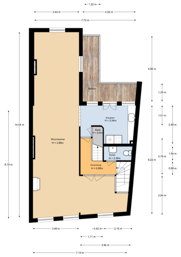 Via de bordestrap kom je op de eerste verdieping, waar je de woonkamer en leefruimte vindt. Wat direct in het oog springt? De authentieke houten balken die de ruimte enorm veel sfeer geven. Door het open karakter kun je hier helemaal losgaan met je eigen woonstijl – denk: een ruime zithoek met uitzicht op de straat en een eettafel voor lange avonden met vrienden. Aan de achterzijde vind je een tweede keuken (simpel maar functioneel) met toegang tot het terras dat uitkijkt op de patio.