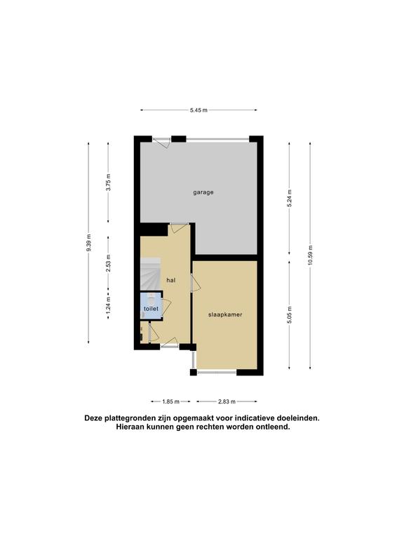 Je komt binnen in een ruime hal, van waaruit je toegang hebt tot de eerste slaapkamer. Naast slaapkamer is deze kamer ook goed te gebruiken als bijvoorbeeld kantoor aan huis. Tegenover de slaapkamer vind je het toilet. Aan de achterzijde heb je toegang tot de garage. Hier kan de auto droog geparkeerd worden, maar ook is er ruimte voor het opbergen van fietsen en dergelijke.