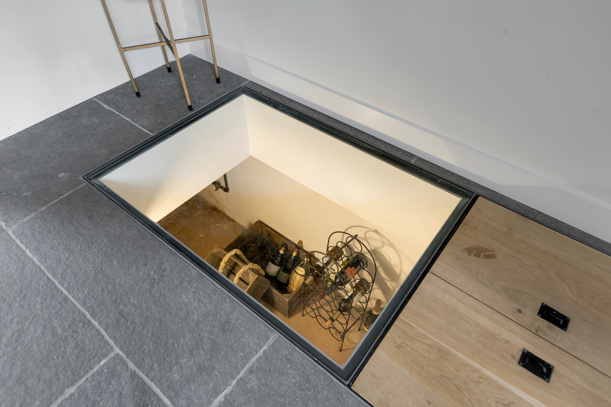 Bij binnenkomst kunnen de schoenen uit, want de woonkamer en keuken beschikken over vloerverwarming. De grote tegels maken dat je daar optimaal van kunt genieten. Voor een gezellige zithoek is ruimte aan de voorzijde van de woning. Hier geniet je na een drukke werkdag van een goede film op de bank. Voor samen uitgebreid tafelen, creëer je een eethoek aan de achterzijde, grenzend aan de keuken. Ben je een echte wijnliefhebber? Dan ben je bij het zien van de kelder verkocht. Een glazen plaat in de vloer geeft een subtiel doorkijkje naar de kelder, waar jij jouw favoriete wijnen kunt bewaren.