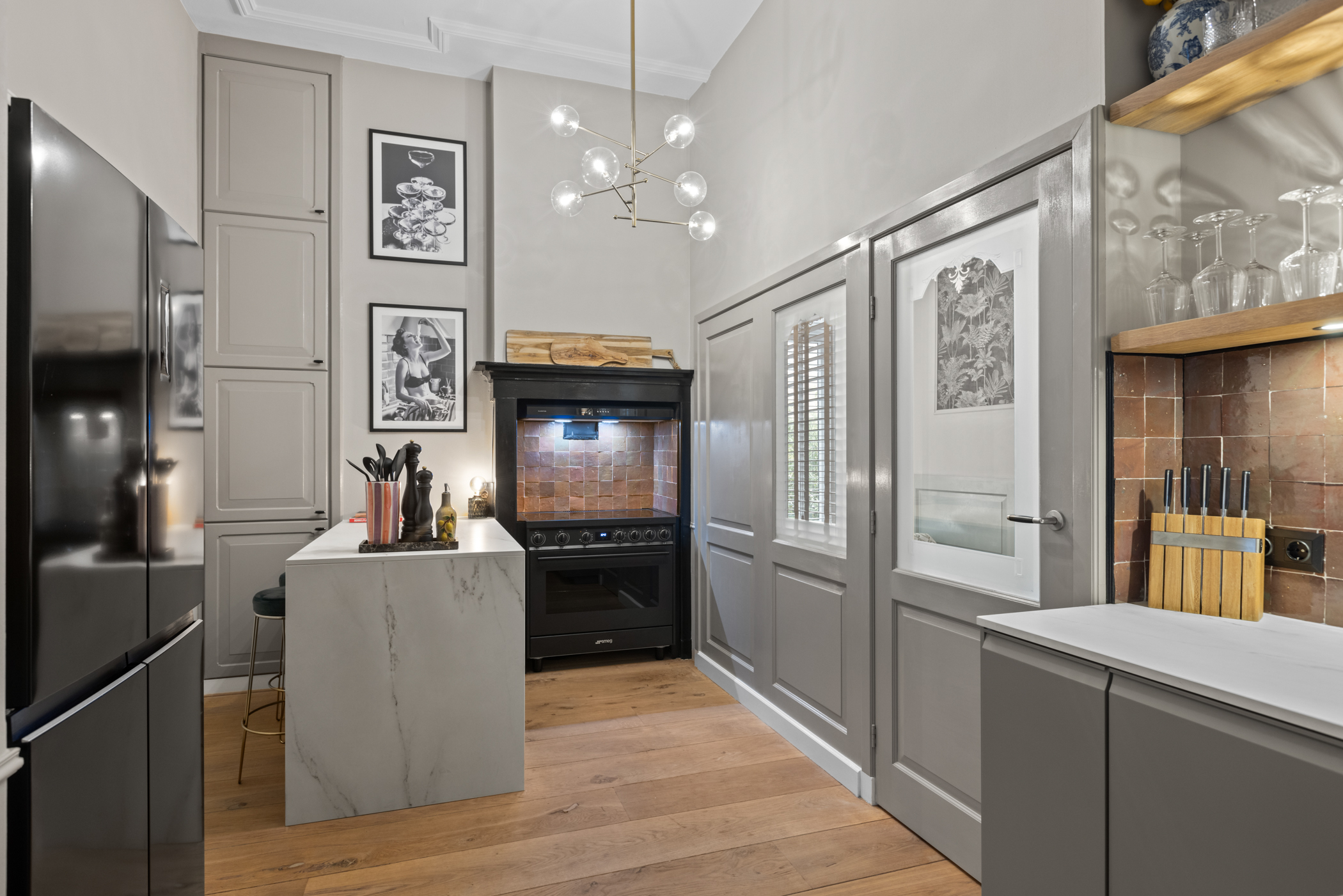 Centraal in het appartement vind je een echte woonkeuken, voorzien van diverse moderne apparatuur voor het koken van een sterrenmaaltijd. Denk daarbij aan een SMEG-fornuis met inductiekookplaat en grote oven en een vaatwasser. Bij een sterrenmaaltijd past een goede wijn en zelfs daar is aan gedacht. Zo beschikt het (schier-)eiland over een wijnkoeler. Daarnaast biedt het eiland volop werk- en opbergruimte. Ideaal wanneer je uitgebreid staat te koken. Liefhebbers van koken komen deze keuken niet meer uit!