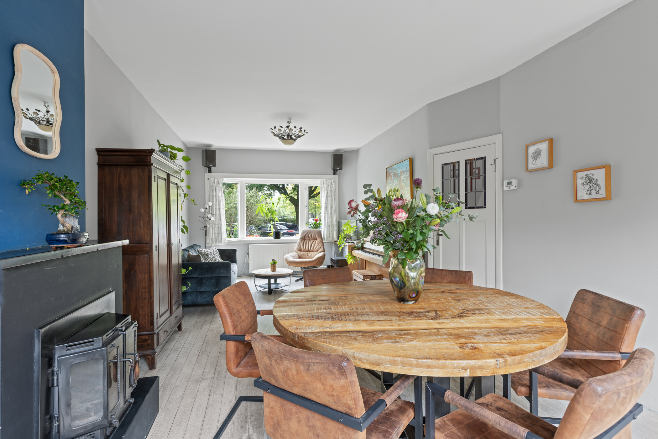 Via de hal kom je binnen in de woonkamer. De plek om samen te eten, spelen en te ontspannen. Zo is er ruimte voor een gezellige zithoek om na een drukke werkdag tot rust te komen. Vanuit jouw favoriete fauteuil geniet je van het uitzicht over het groene park voor de woning. Ook is er ruimte voor een eethoek om met het hele gezin uitgebreid te kunnen tafelen en waar de kids na school samen een spelletje spelen. De houtkachel zorgt op winterse dagen voor nog wat extra gezelligheid. Openslaande deuren aan de achterzijde van de woonkamer bieden direct toegang tot de achtertuin. Zo voelt de tuin op zomerse dagen als jouw tweede woonkamer.