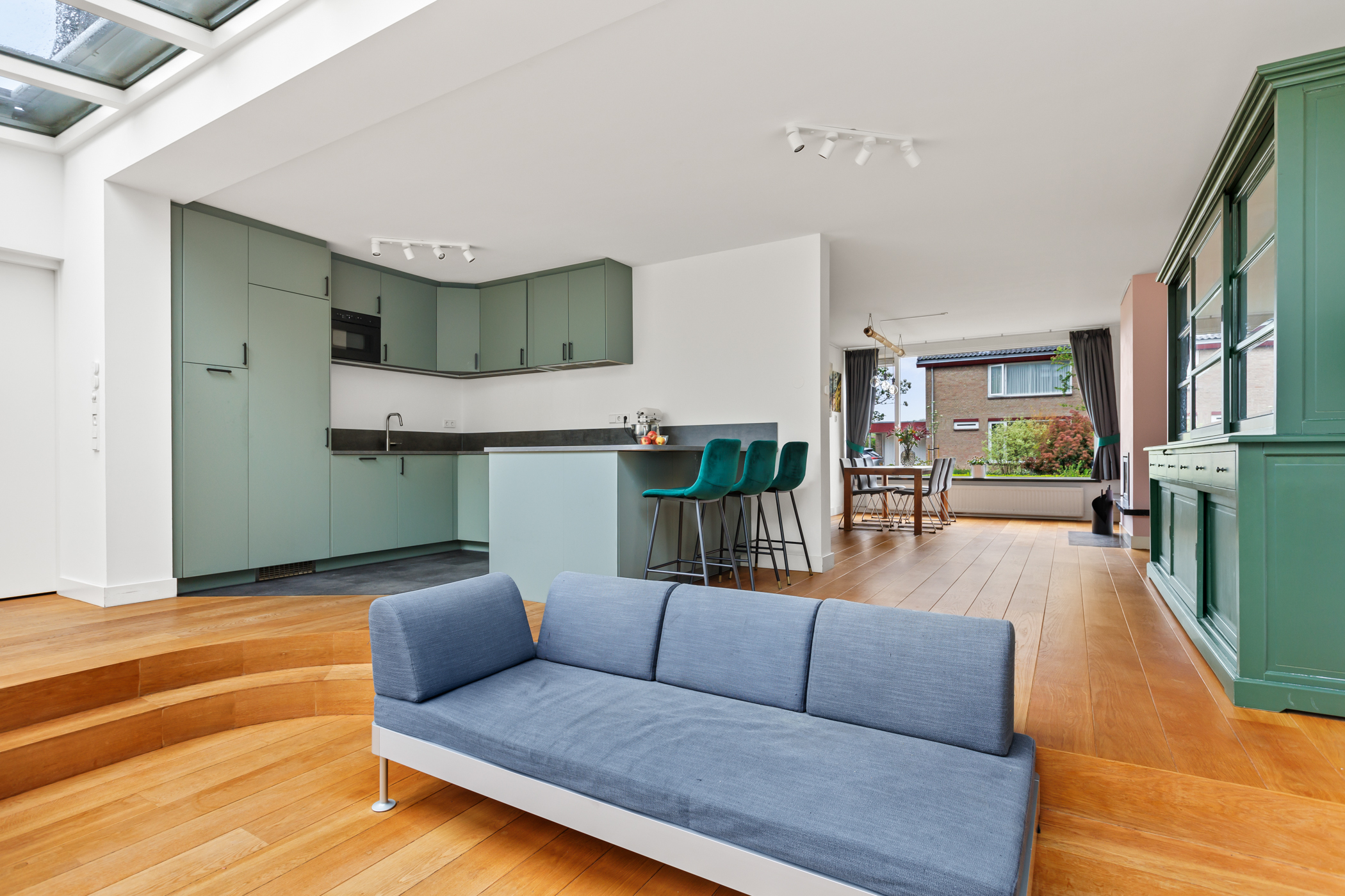 Zet op zomerse dagen die tuindeuren maar open! Deze harmonicadeuren kunnen over de hele breedte geopend worden, waardoor het binnen- en buitenleven perfect samen komen. Zie je het al voor je? Een zomerse barbecue met de hele familie in jouw achtertuin? De kinderen kunnen heerlijk buiten spelen, samen gezellig borrelen in de zitkuil en dat alles met de keuken dichtbij. Het vele groen in de tuin zorgt dat je hier heerlijk beschut van de zon kunt genieten.