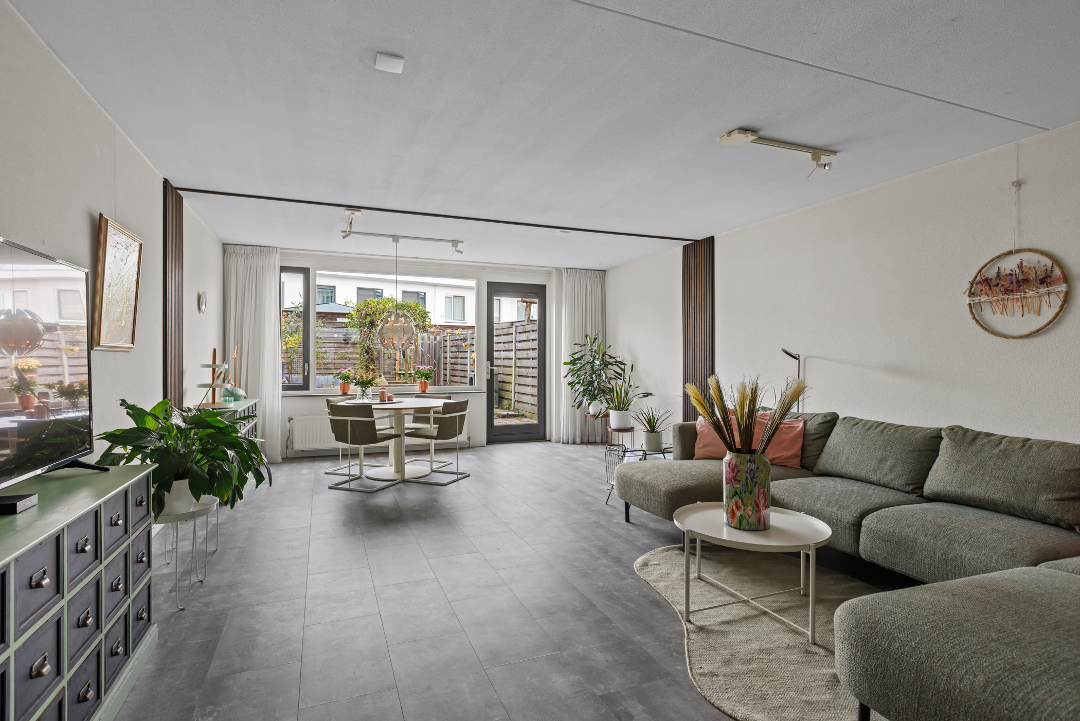 Aan de achterzijde bevindt zich de uitgebouwde woonkamer, waar je in het midden een gezellige zithoek hebt om lekker te relaxen, tv te kijken of een boek te lezen. Achterin is ruimte voor een eetkamertafel met uitzicht op de achtertuin. Door het grote raam aan de achterzijde komt er veel natuurlijk licht binnen en heb je direct contact met buiten.